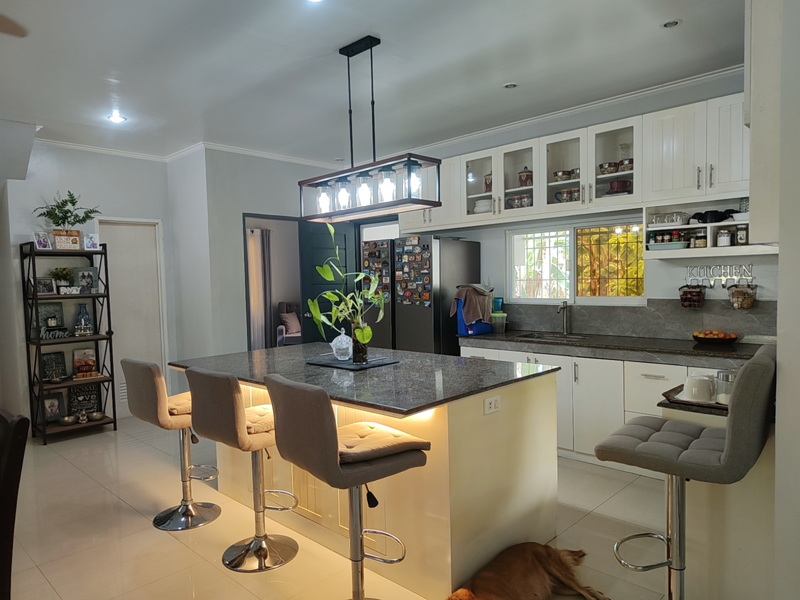 Kitchen and Dinning:- Complete Dinning Set 8 seater.- Island counter with 4 high chairs,- Double Door Refrigerator- 4 Burner stove with 2 electric plate range and Oven- Coffee maker, Heater, Rice cooker- Food Jars and Eating and Cooking Utensils- w/ food storage room- Laundry Area w/ Automatic Washing Machine.- Water Pressure Pump and Tank